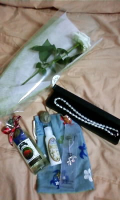 白薔薇・ウォッカ・淡水パールネックレス・可愛いリスの置物・ハワイのストラップ・ローション・手作りの巾着・・・